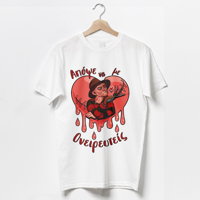 Μπλούζα με χιουμοριστική εικόνα εμπνευσμένη από την ταινία «Ο Εφιάλτης στο δρόμο με τις λεύκες» με τον Φρέντυ Κρούγκερ να λέει: «Απόψε να με ονειρευτείς» για να φορέσεις ή να χαρίσεις ως δώρο στον φίλο σου που τρελαίνεται για ταινίες τρόμου και φρικιαστικά αστεία!