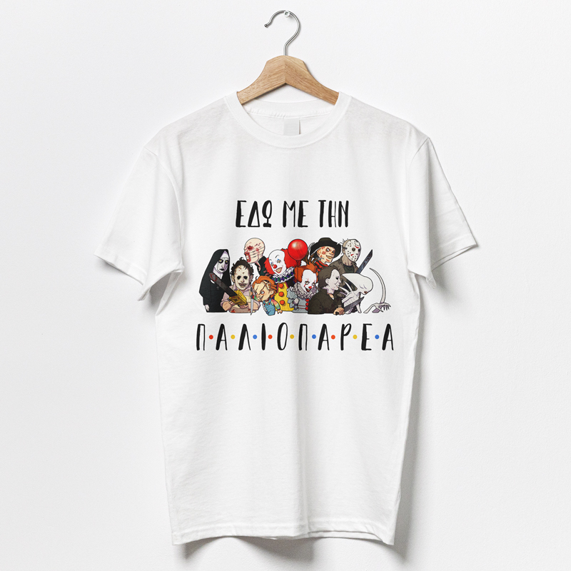 Μπλούζα με χιουμοριστική εικόνα εμπνευσμένη από τους πιο κακούς πρωταγωνιστικούς χαρακτήρες horror ταινιών με τυπωμένο το μήνυμα: « Εδώ με την… Παλιοπαρέα» για να φορέσεις ή να χαρίσεις ως δώρο!