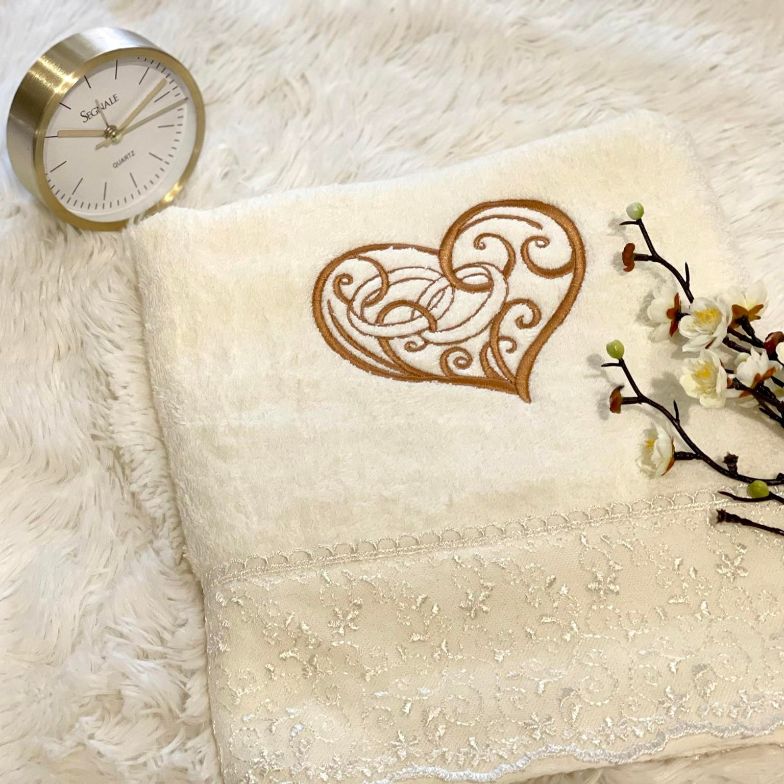 Πετσέτα χεριών με δαντέλα με κεντημένο σχέδιο Καρδιά με Βέρες & όνομα