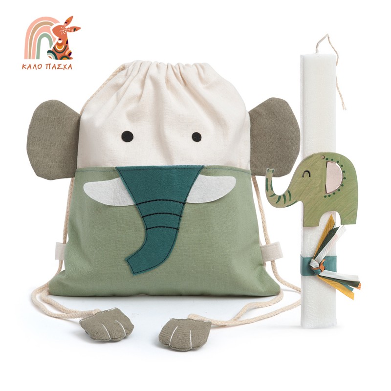 Πασχαλινό σετ δώρου: Περιλαμβάνει 1) το υφασμάτινο backpack με σχέδιο ελεφαντάκι 2) τη λαμπάδα διακοσμημένη με ξύλινο διακοσμητικό ελεφαντάκι σε πράσινο χρώμα